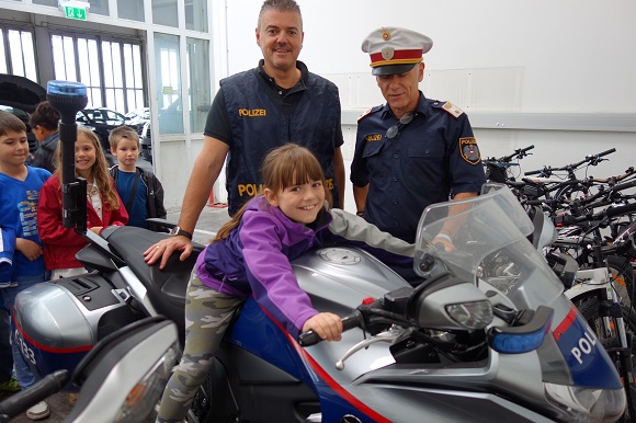 und den Helm aufsetzen durften, auf dem Motorrad saßen und im Polizeiauto