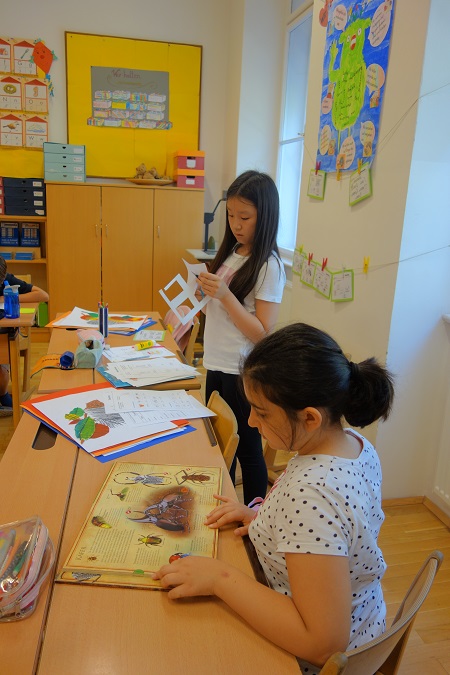Mit summenden, brummenden, fliegenden und krabbelnden kleinen Tieren beschäftigten sich die Kinder der 2a Klasse im Rahmen eines Insekten-Projektes. Lebensraum, Lebensweise, Körperbau, Mundwerkzeuge… dieser interessanten Tiergattung wurde anhand vielfältiger Materialien erforscht.