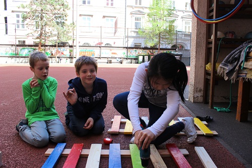 Die Kinder von der Nachmi gestalten die Bretter bunt. Verwendet werden