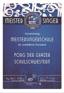 Auch im Jahr 2020 ist das ORG der Schulschwestern Träger des Meistersinger-Gütesiegels. Dieses Gütesiegel wird an steirische Schulen verliehen, an denen vorbildliche Chorarbeit geleistet wird. Die feierliche Verleihung des Gütesiegels findet voraussichtlich im Herbst statt. Mag. Christina Eichberger zurück